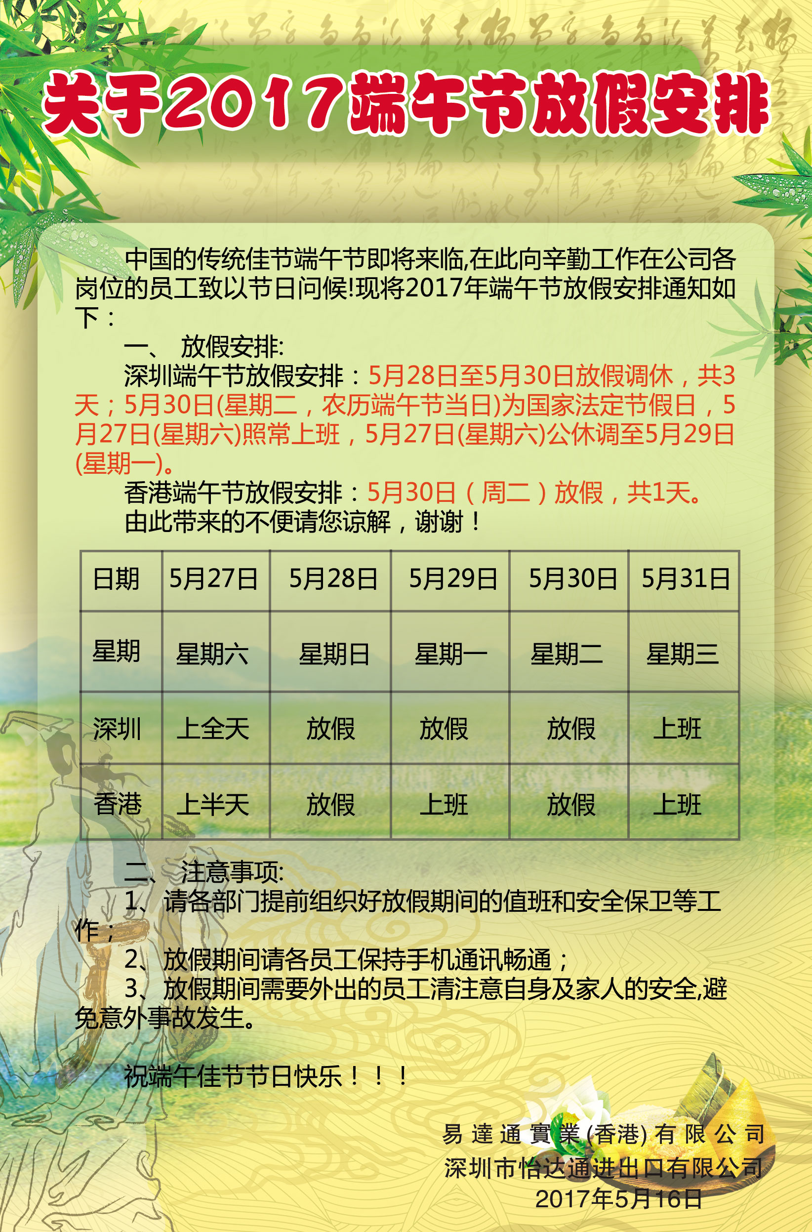 2017易達(dá)通端午放假通知