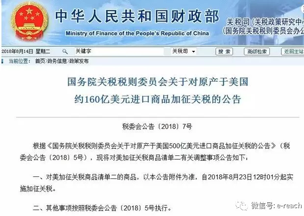 財政部于8月8日發(fā)布了對原產(chǎn)美國的部分商品加征關(guān)稅的公告,主要闡述本次加征關(guān)稅涉及的160億美元商品,以及將于2018年8月23日起開始執(zhí)行加征。