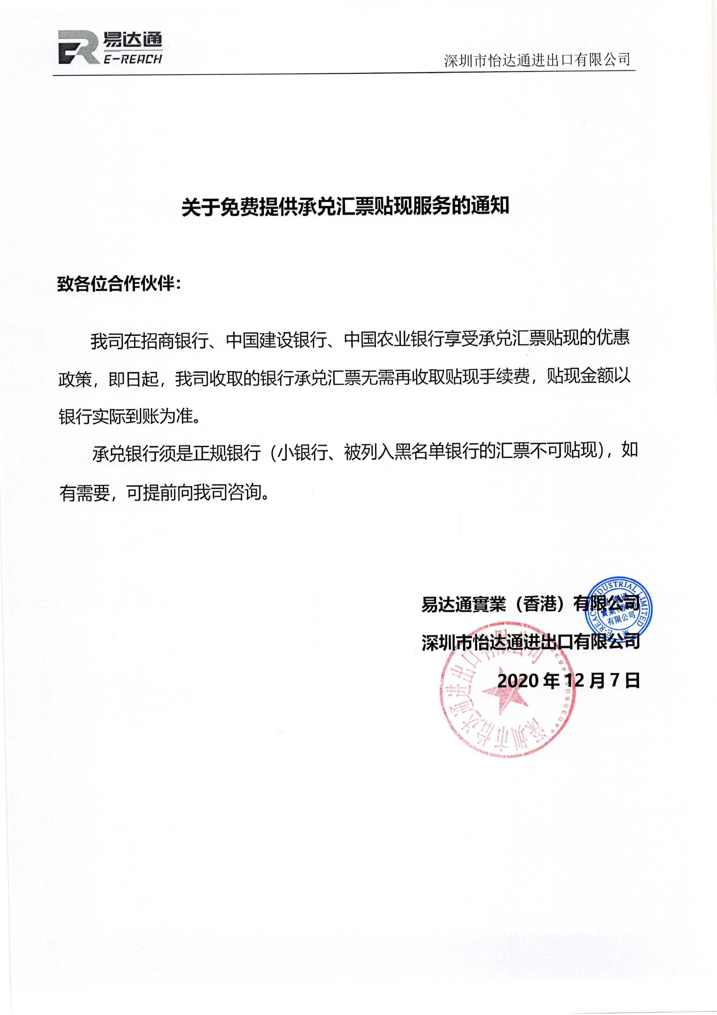 關(guān)于免費(fèi)提供承兌匯票貼現(xiàn)服務(wù)的通知